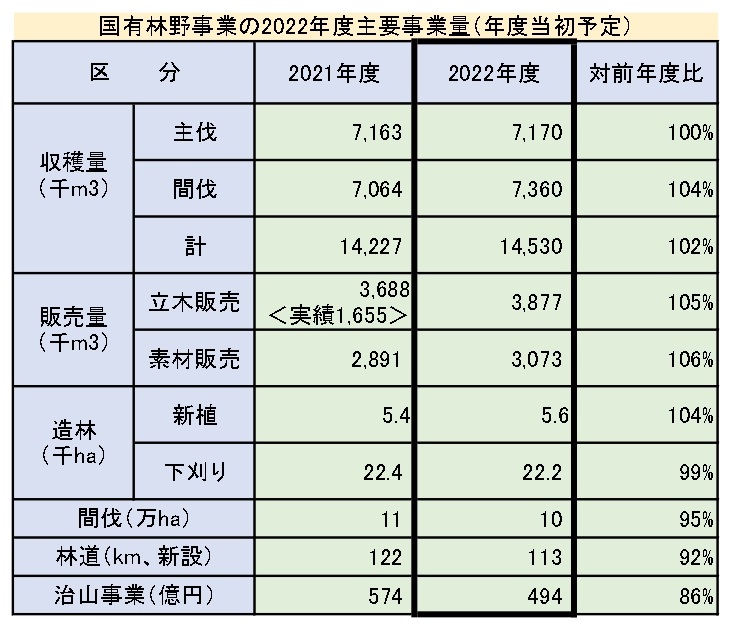 国有林野事業の主要事業に関する今年度(2022年度)の計画量が明らかになった(林野庁国有林野部が4月22日に発表)。国産材の供給力アップが求められていることを踏まえ、国有林材の販売量を増やす方針だ。