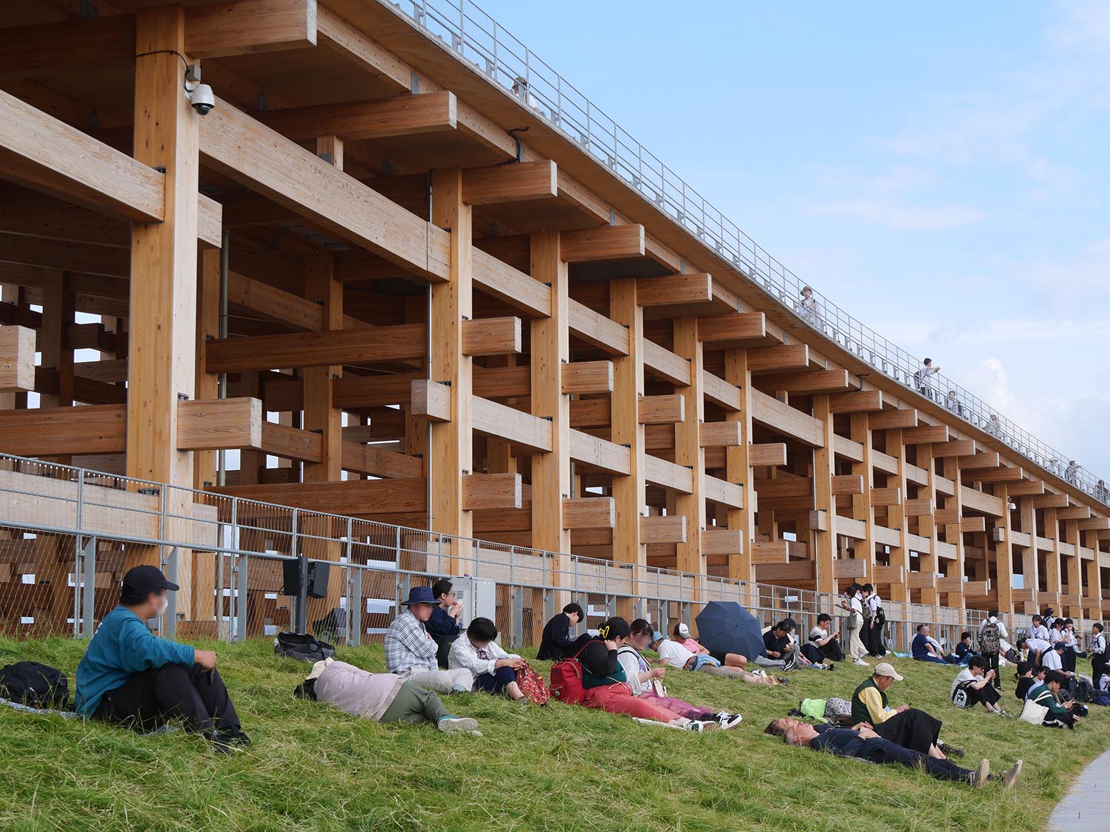 夢洲駅の「カームダウンスペース」をスギ材スリットで木質化