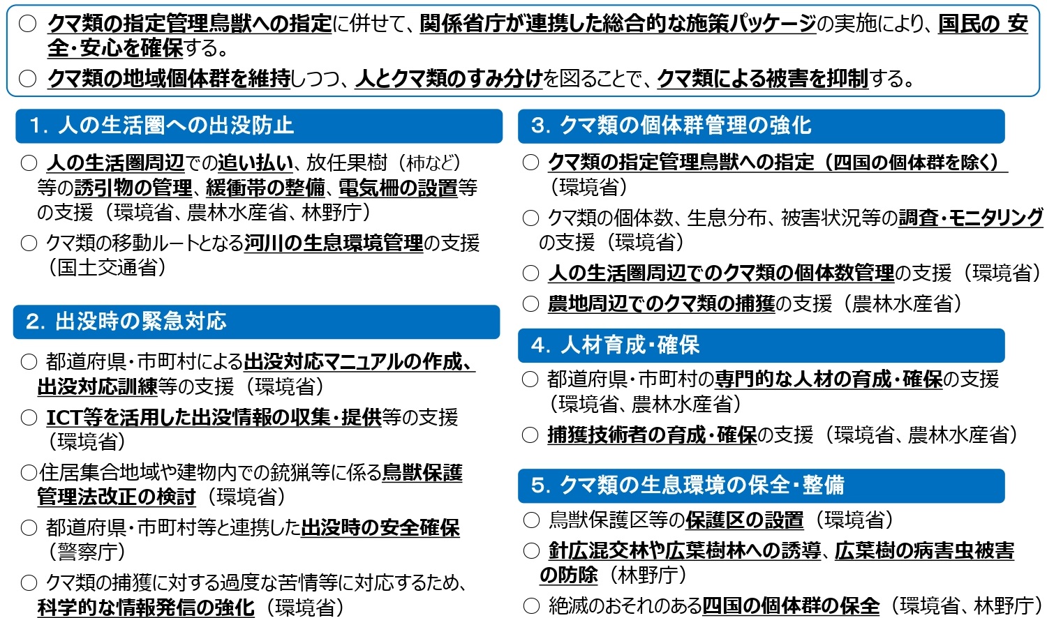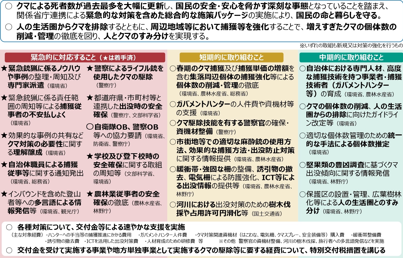クマによる死者数が過去最多になるなど事態が深刻化していることを踏まえ、政府は11月14日に2回目の関係閣僚会議(議長=木原稔・内閣官房長官)*1を開いて、新たな「クマ被害対策施策パッケージ」をまとめ