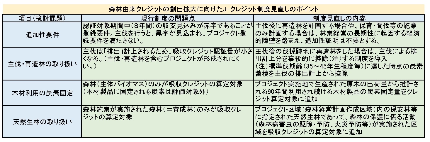 政府が重点課題に位置づけている森林由来J-クレジット(吸収クレジット)の創出拡大に向けた制度見直しの全容が決まった。木材製品に固定されている炭素量を評価する方法についても整理がつき、8月5日のJ-ク