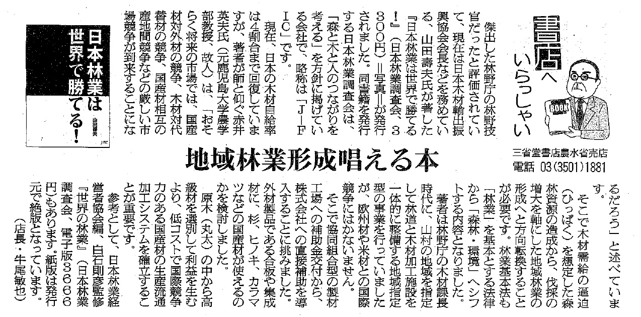 日本農業新聞の1月12日付け書評欄(4面)で、書籍『日本林業は世界で勝てる!』が紹介されました。三省堂書店農水省売店の牛尾敏也店長が評者となり、「低コストで国際競争力のある国産材の生産流通加工システ