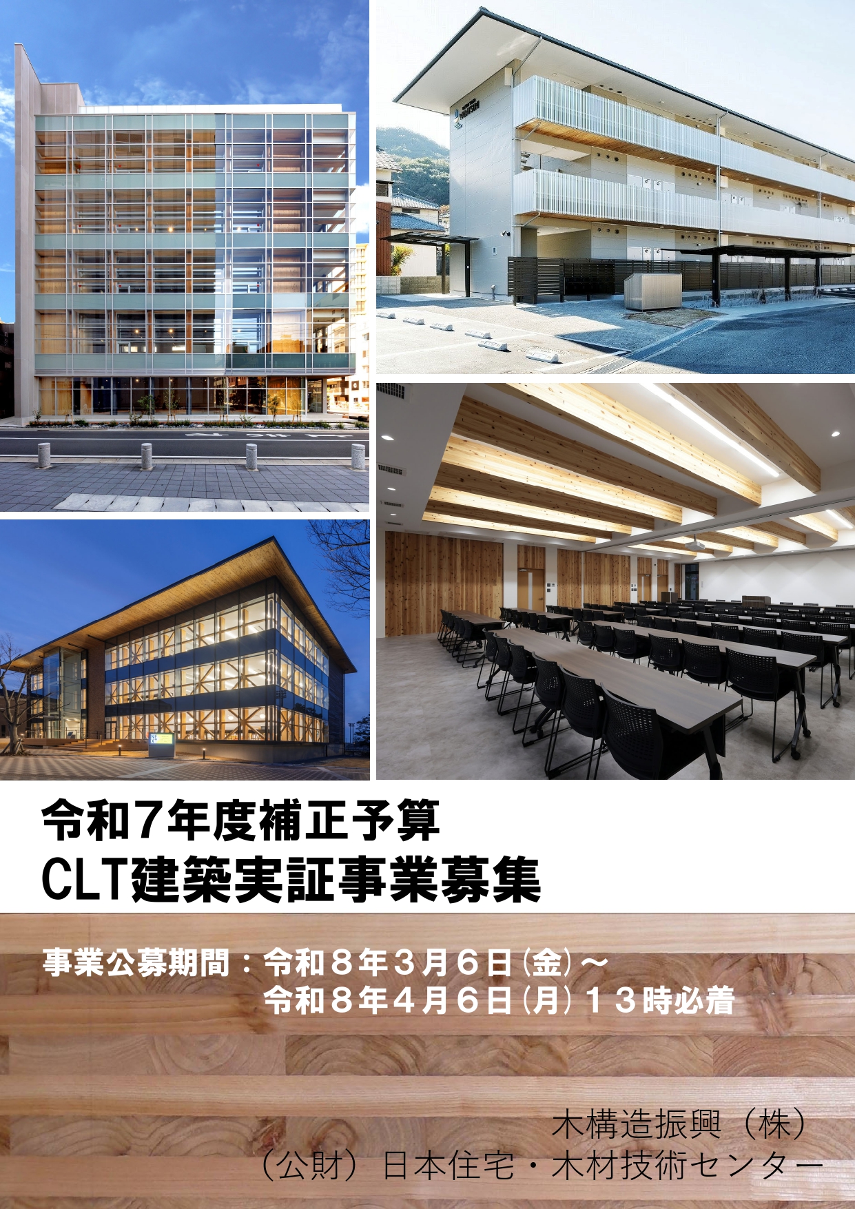木構造振興(株)と日本住宅・木材技術センターは、今年度(2025年度)の「CLT活用建築物等実証事業」(林野庁補助事業)の実施者を募集している。CLTを使った建築物の設計・建築などでモデルとなる取り